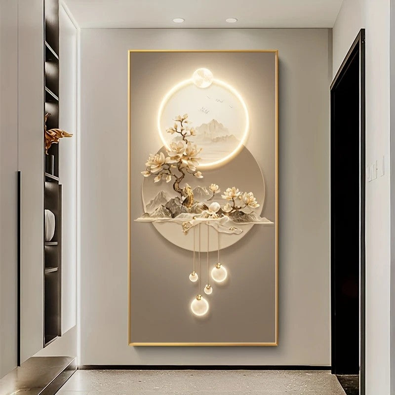 1. Ponto Focal de Poder: A imagem da árvore dourada atua como um ímã visual. Ela organiza o ambiente ao seu redor, dando sentido e hierarquia à sua decoração.
