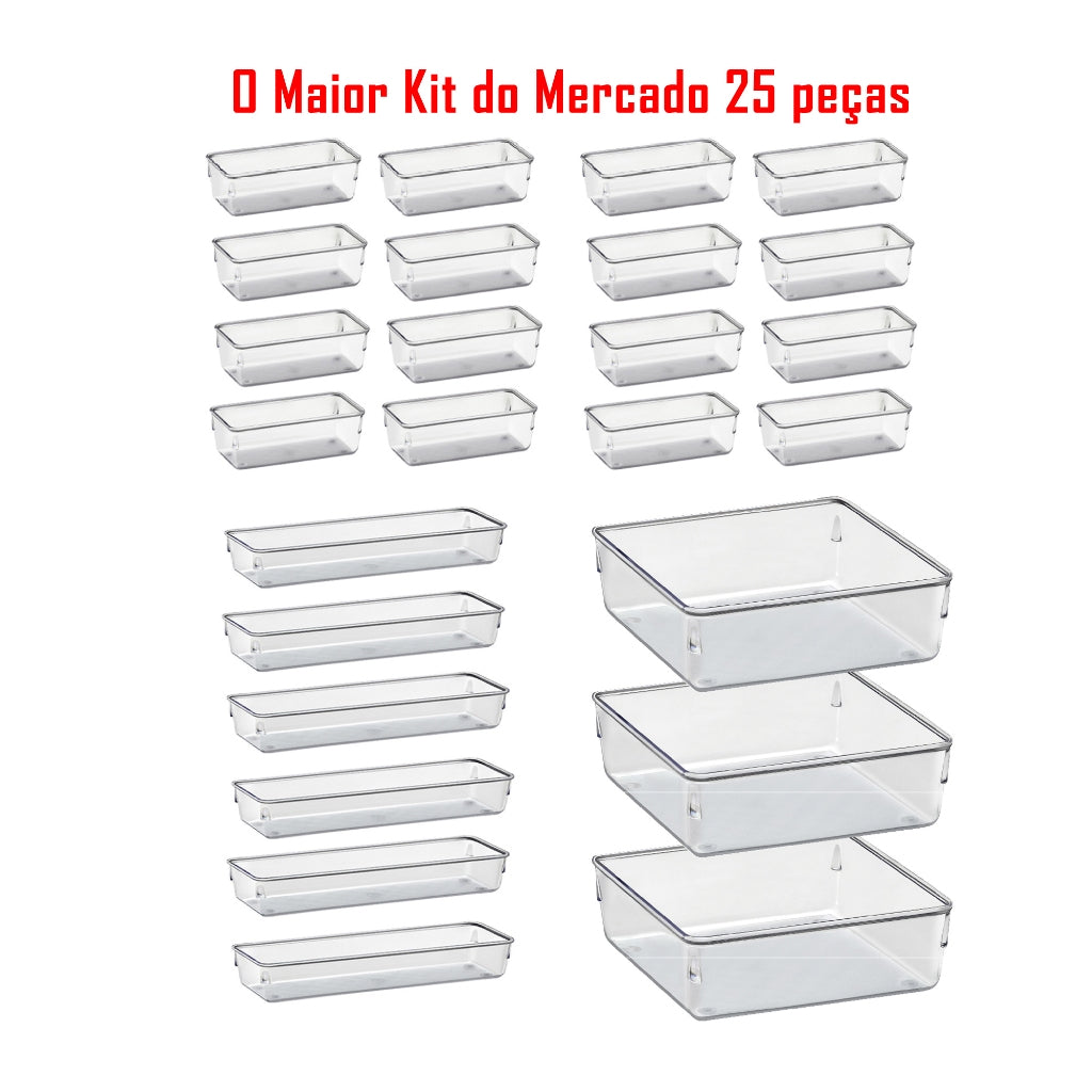 Apresentamos o Kit Luxo 25 Organizadores Modulares em Acrílico Cristal. Ele é o seu engenheiro de organização pessoal.