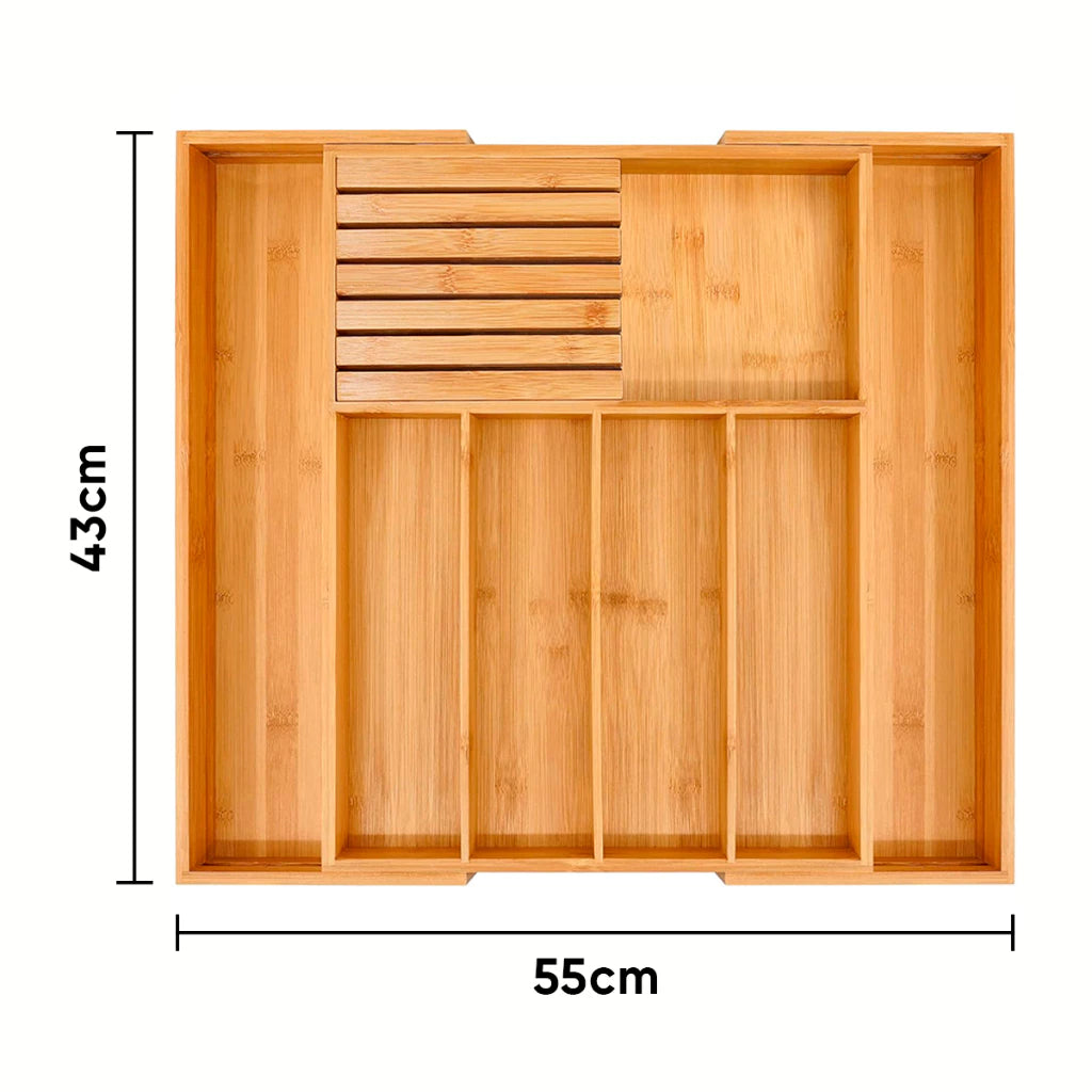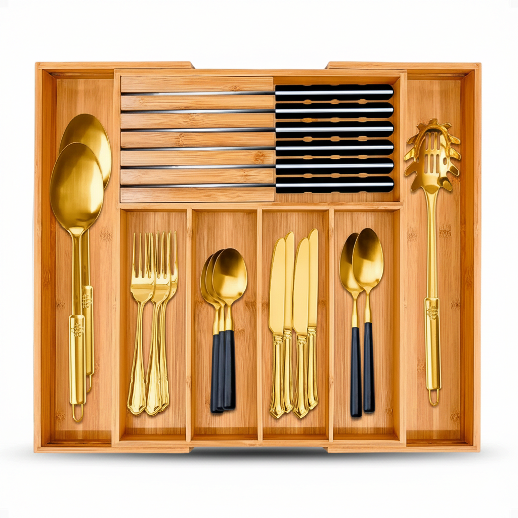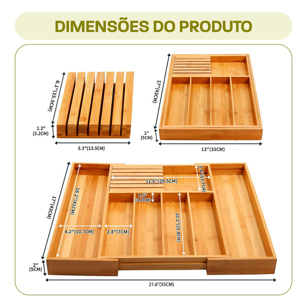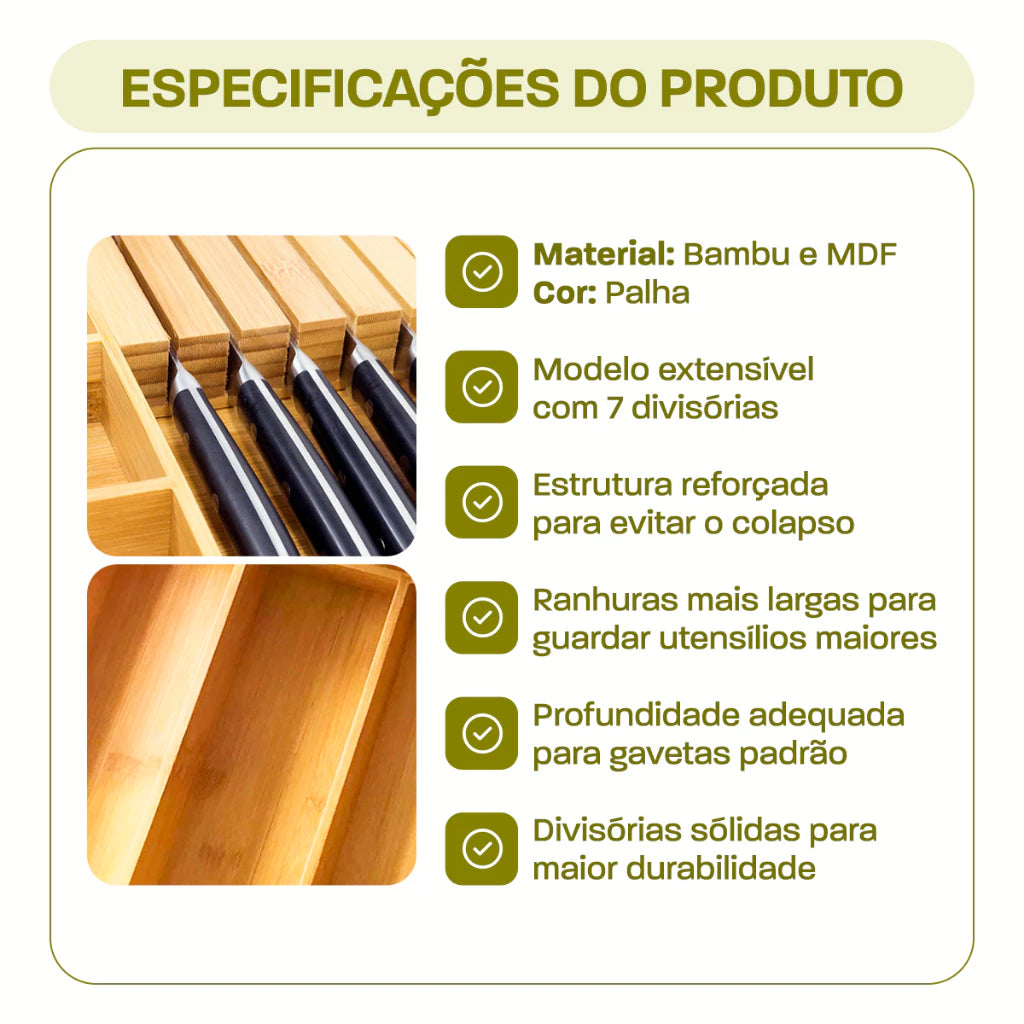 🔇 Silêncio e Proteção: O acabamento em bambu evita o barulho metálico dos talheres batendo no fundo da gaveta e protege o fio das suas facas de corte contra riscos.