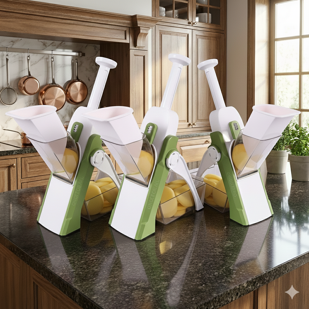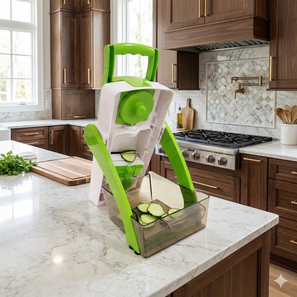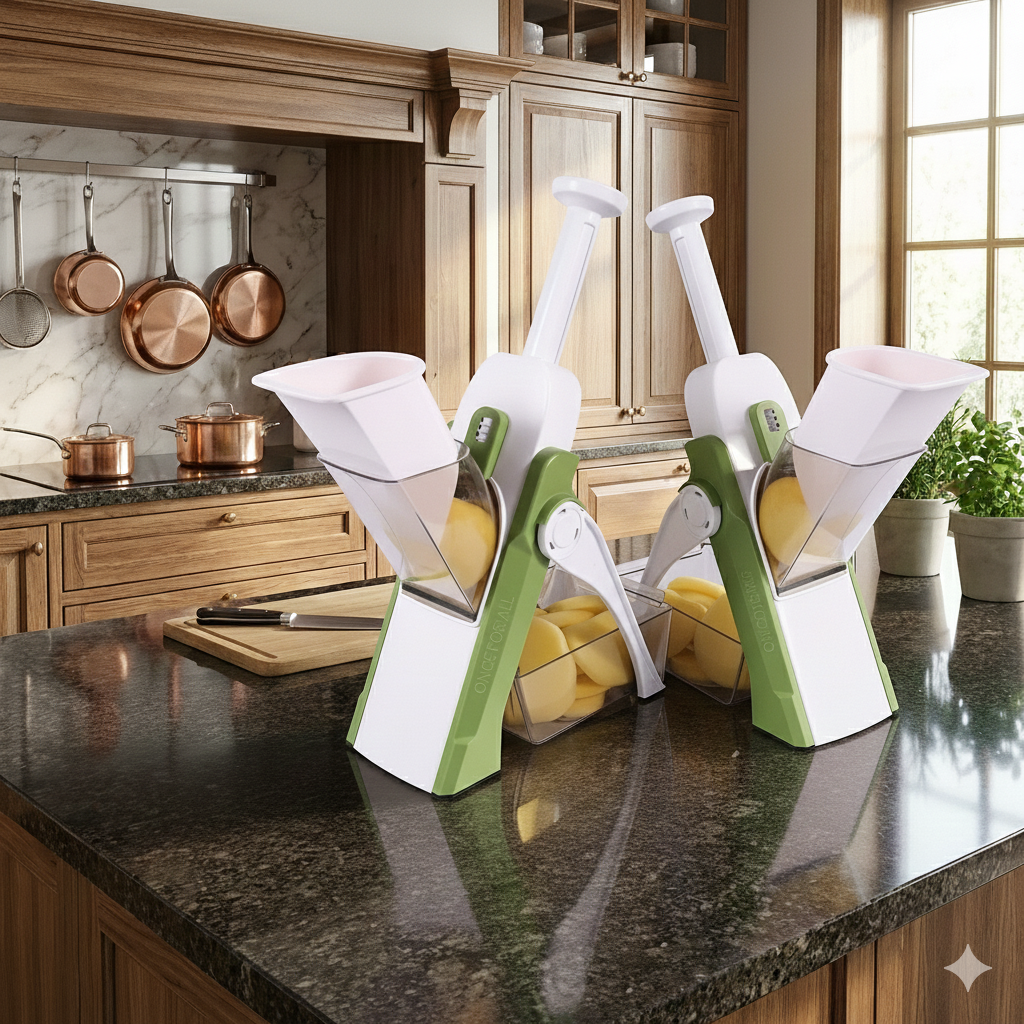 ⚡ Velocidade de Lâmina Dupla: O sistema de alavanca multiplicadora de força permite que você corte legumes duros, como batatas e cenouras, com um único movimento suave.