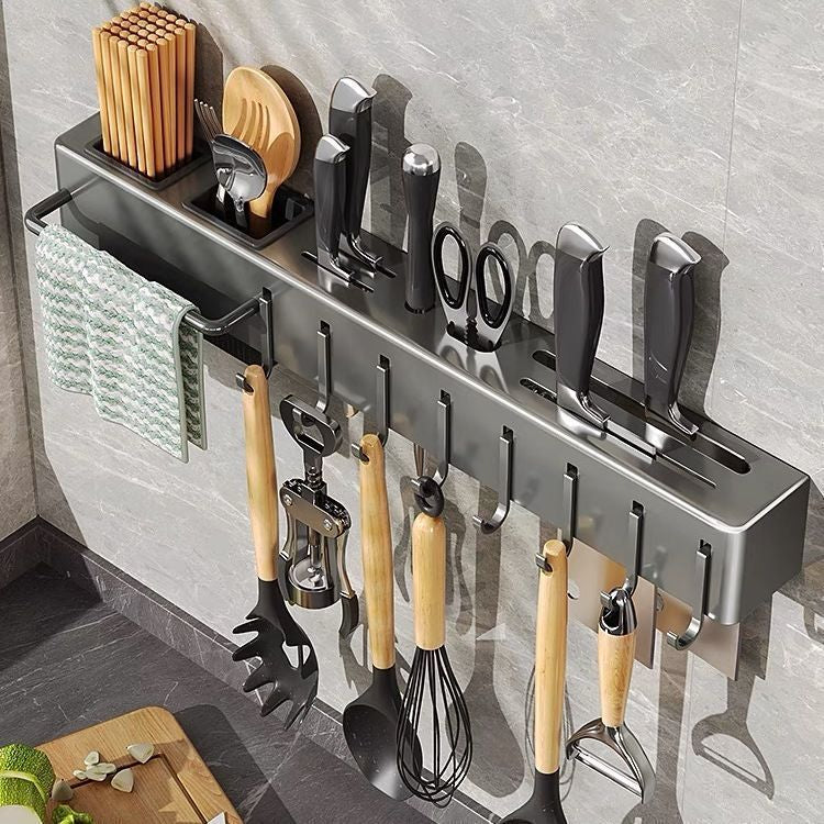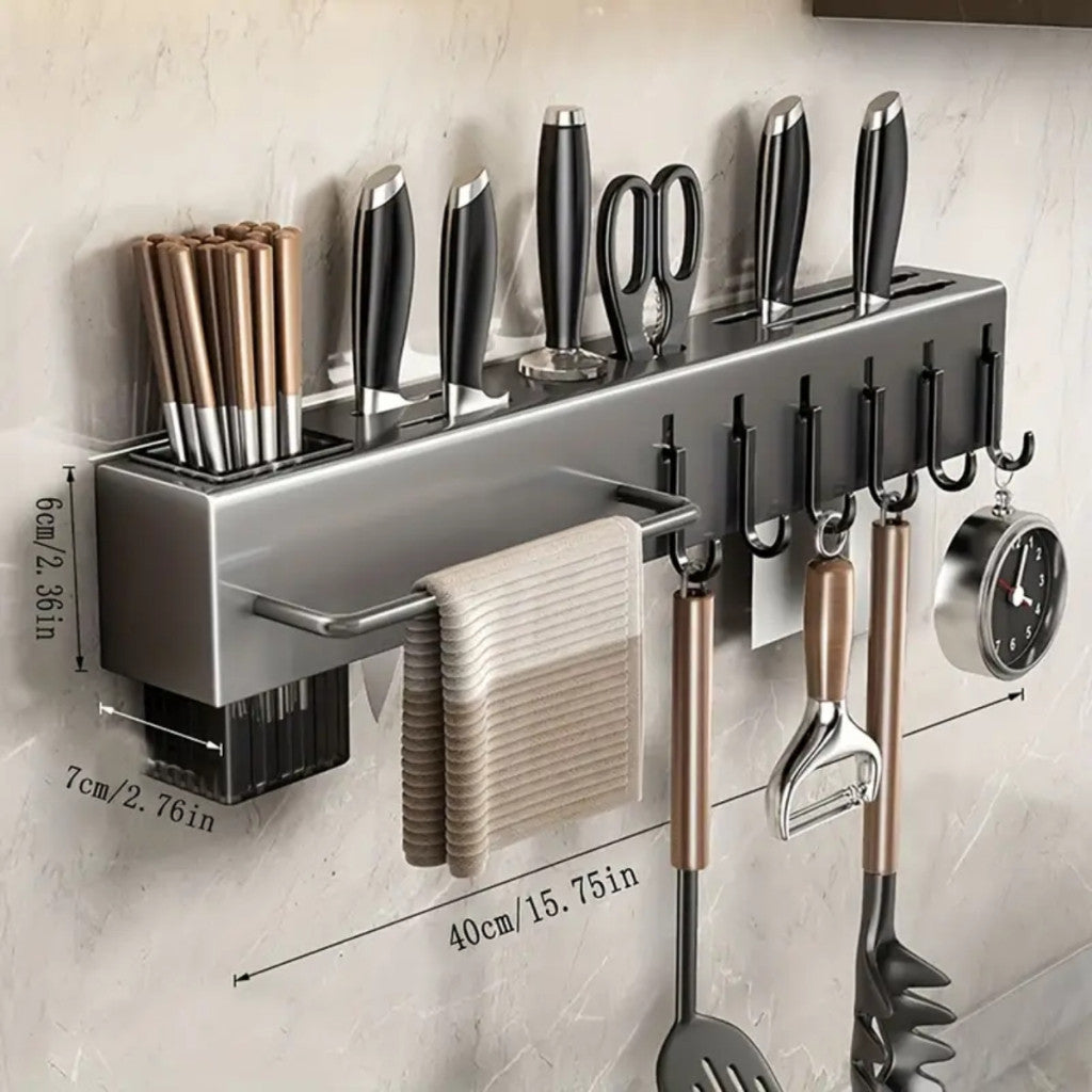 Economia de Espaço: O suporte libera a gaveta que antes era dedicada às facas, transformando um espaço morto da parede em um ponto de organização funcional.